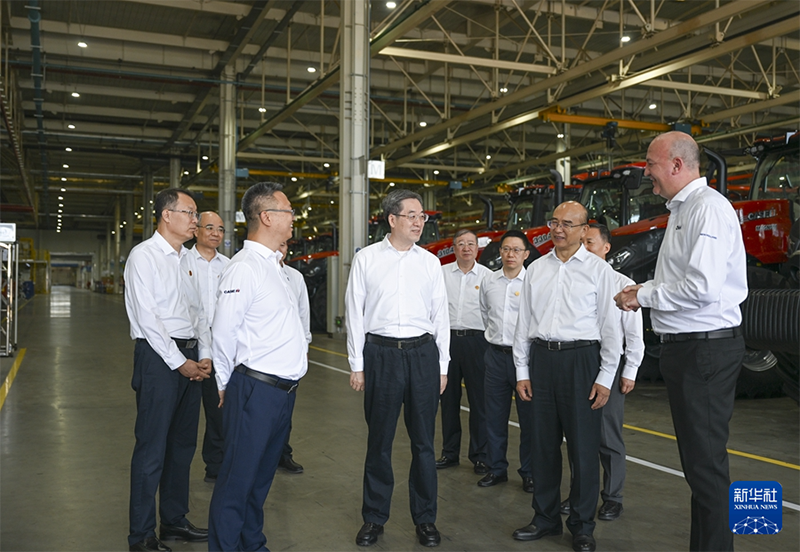 7月7日至9日,中共中央政治局常委、国务院副总理丁薛祥在黑龙江、吉林调研。这是7月7日,丁薛祥在凯斯纽荷兰工业(哈尔滨)机械有限公司调研。(新华社记者 张领/摄)