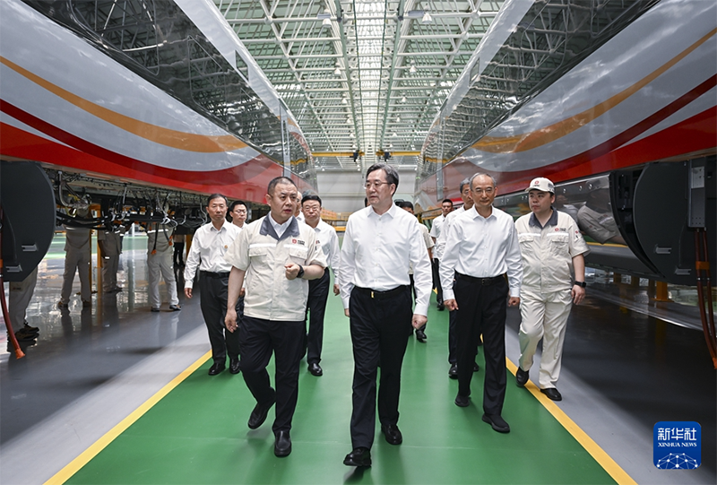 7月7日至9日,中共中央政治局常委、国务院副总理丁薛祥在黑龙江、吉林调研。这是7月8日,丁薛祥在中车长春轨道客车股份有限公司调研。(新华社记者 张领/摄)